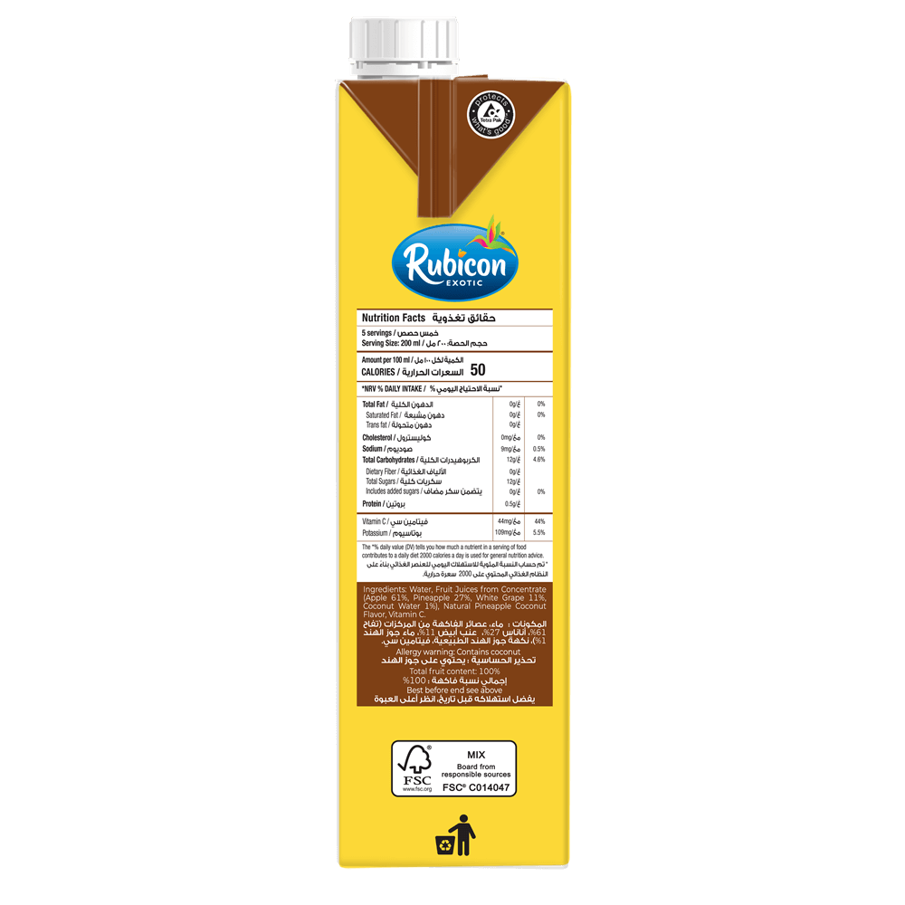 Rubicon Pineapple Coconut No Added Sugar Fruit Juice is a refreshing and flavourful beverage, crafted from high-quality pineapples and coconut. This 1-liter juice offers a naturally sweet taste without any added sugars, making it a healthier choice for those looking to enjoy the rich flavour of pineapples and coconuts without the extra calories. Perfect for any occasion, it can be enjoyed on its own or used as a mixer in cocktails. With its vibrant colour and authentic taste, Rubicon Pineapple Coconut Juice is a delightful option for fruit juice enthusiasts seeking a guilt-free indulgence.
